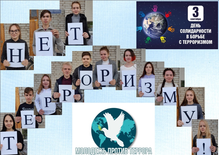 В рамках Дня солидарности в борьбе с терроризмом 1 сентября были проведены беседы на классных часах " Трагедия Беслана". 3 сентября ученики старших классов Архангельской средней школы приняли участие в совместной с сельским ДК акции "Нет терроризму!"